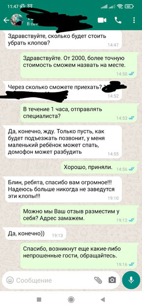 Если вы впервые столкнулись с проблемой вредителей, то не стоит переживать, даже самый запущенный случай решаем. Но заказывать дезинсекцию за 1000 рублей не стоит, поскольку никто не будет делать качественную работу за такую сумму.